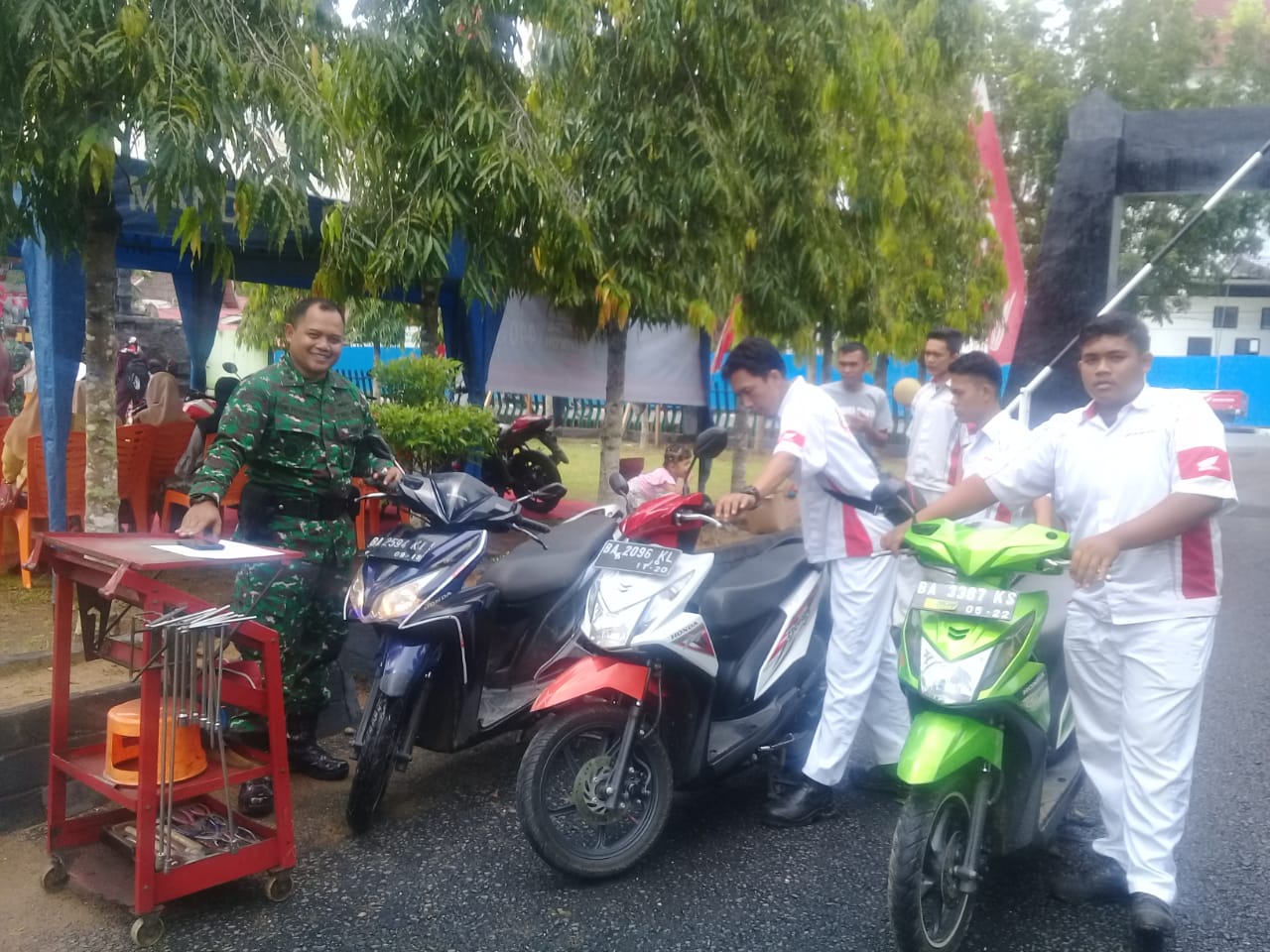 Service Gratis itu dilaksanakan di halaman Makodim 0310/SS. Selain kenderaan prajurit dan istri prajurit juga kenderaan milik masyarakat umum juga kebagian service gratis. Bagi anda yang tukar oli cukup hanya bayar Rp21 ribu.
