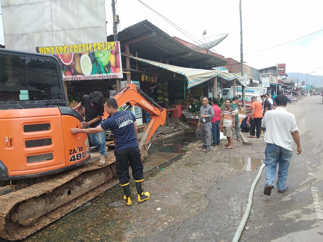 JURNAL SUMBAR | Sijunjung – Tak ingin pemukiman warga tergenang air, puluhan warga bersama anggota Polri, Damkar, dimotori Syahbuddin Datuk Sinaro (Datuk Abu) dan anggota DPRD Sijunjung 2019-2024 terpilih Indrawadi pada Selasa (23/7/2019) melakukan pembersihan saluran draenase yang tersumbat di ruas jalan negara di depan Pasar Lama Sungai Tambang, Kecamatan Kamangbaru, Kabupaten Sijunjung, Sumatera Barat.