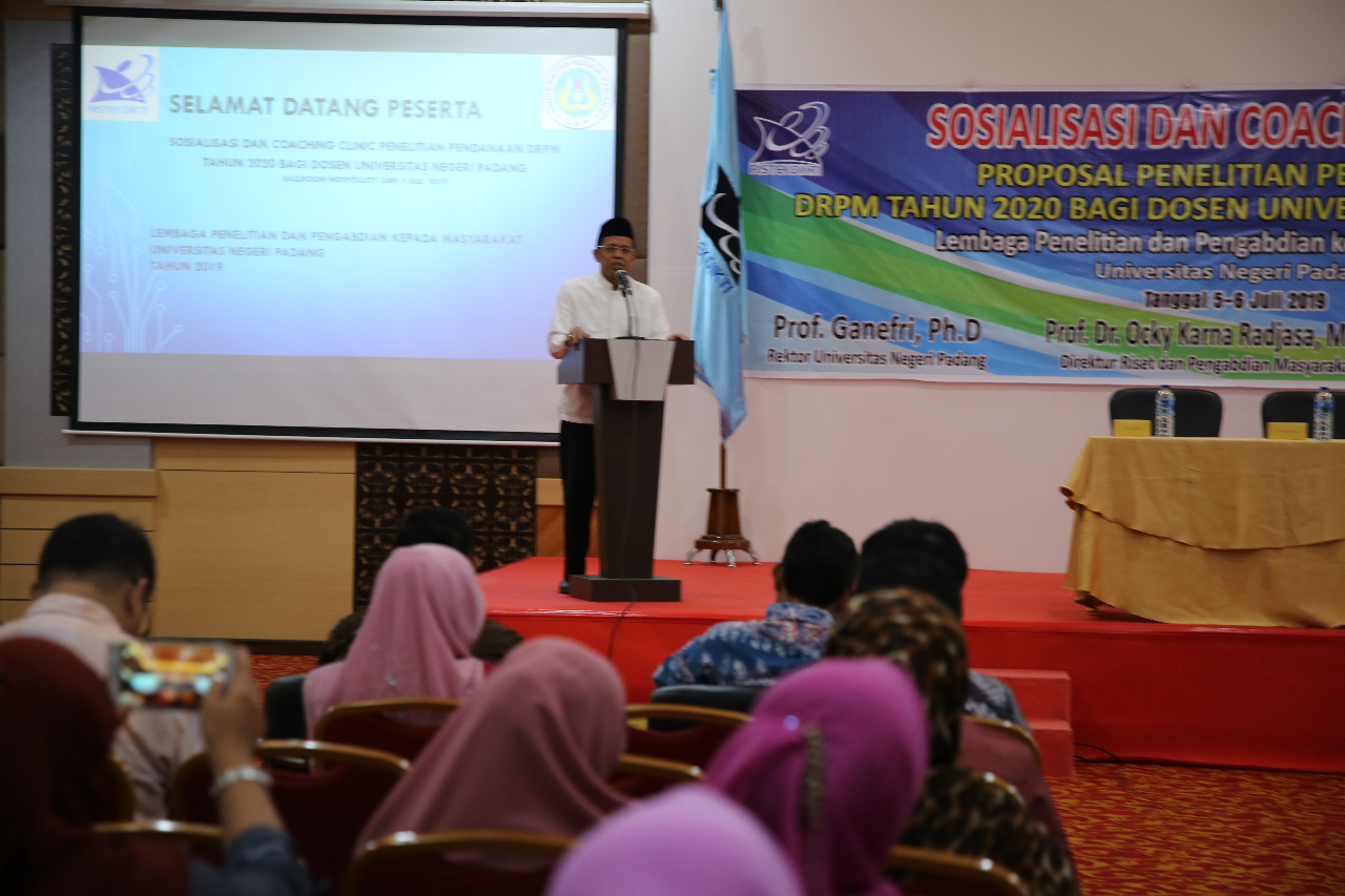 “Pengalaman kami dalam meningkatkan penelitian dosen tidak cukup dengan mengalokasikan 15% dana PNBP untuk riset dan pengabdian masyarakat, dapat dukungan dari Kemenristekdikti suatu hal penting. Untuk itu kepada para dosen mesti berpacu meraih dana DRPM pada tahun 2020 mendatang, melalui sosialisasi dan coaching clinic mari kita tingkatkan raihan dana penelitian DRPM,” ujar Rektor UNP, Prof Ganefri, PhD saat membuka kegiatan ini, Jumat (5/7).