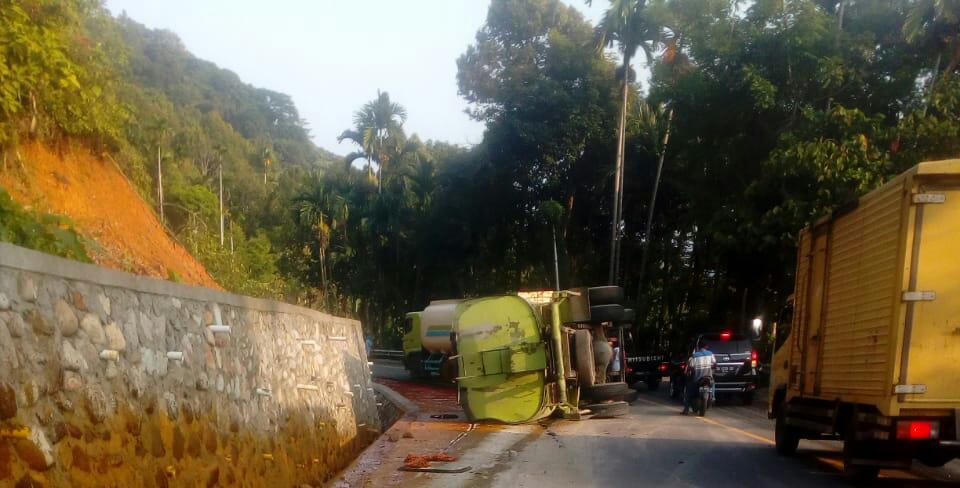 JURNALSUMBAR | Pesisir Selatan – Diduga akibat hilang kendali saat menurun jalan di Bukit Pulai, Sabtu (6/7/2019) mobil tanki membawa minyak CPO sawit terbalik. Dan, akibatnya tumpahan minyak CPO membuat sebagian ruas jalan tersebut tergenang minyak.
