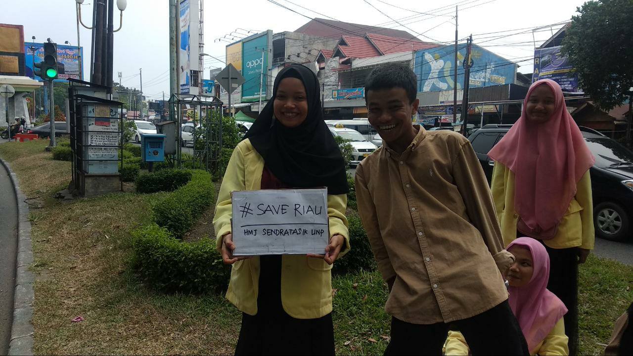 JURNAL SUMBAR | Padang – Jerebu akibat karhutla (kebakaran hutan dan lahan) tengah menyelimuti sebagian besar pulau Sumatra sejak awal bulan September 2019 hingga saat ini. Terkonsentrasi pada Provinsi Riau yang kualitas udaranya sudah rentan mengancam kesehatan penduduknya, Himpunan Mahasiswa Jurusan Seni, Tari, Drama, dan Musik Universitas Negeri Padang (HMJ Sendratasik UNP) menggelar Aksi Peduli Riau pada hari Sabtu 21 September 2019 dari pukul 09.00 – 15.00 WIB di pertigaan lampu merah depan kantor DPRD Sumbar, Ulakkarang, Kota Padang.