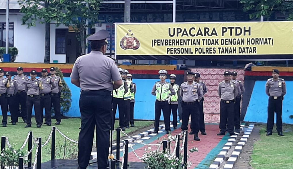 JURNAL SUMBAR | Batusnagkar – Anggota Polres Tanah Datar Bripka NOZRA akhir dipecat dari Kesatuan dalam suatu Upacara PTDH (Pemberhentian Tidak Dengan Hormat) dipimpin Kompol A Daulay mewakili Kapolres Tanah Datar di halaman Polres Tanah Datar, Senin (9/12/19).