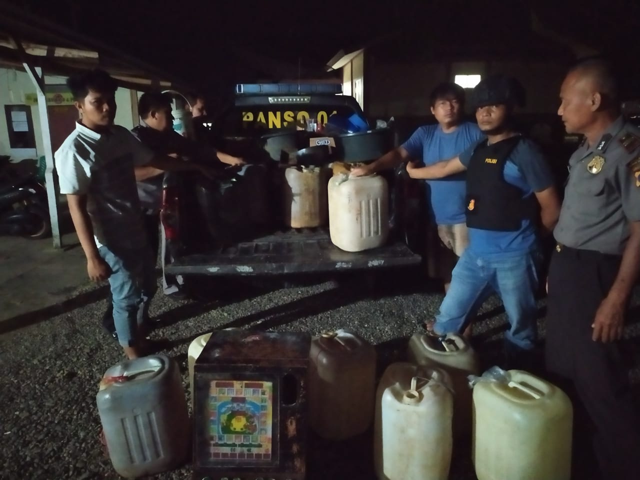 Warung Milik berinisial “E”, 32 Tahun, Swasta, Kecamatan Pancung Soal yang di Sita Tuak sebanyak 1 (satu) jerigen sebanyak 35 Liter dan 1 (satu) Unit Mesin Jack Pot Rusak.