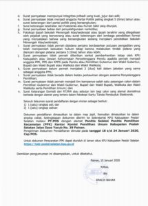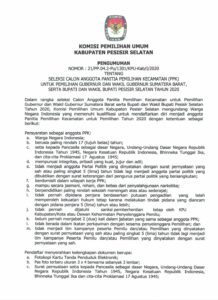Dalam rangka seleksi Calon Anggota Panitia Pemilihan Kecamatan untuk Pemilihan Gubernur dan Wakil Gubernur Sumatera Barat serta Bupati dan Wakil Bupati Pesisir Selatan Tahun 2020, Komisi Pemilihan Umum Kabupaten Pesisir Selatan mengundang Warga Negara Indonesia yang memenuhi kualifikasi untuk mendaftarkan diri menjadi anggota Panitia Pemilihan Kecamatan untuk Pemilihan Tahun 2020 dengan ketentuan sebagai berikut: