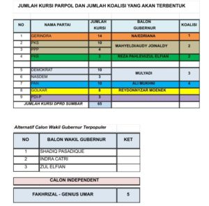 Jika kita lihat dari Jumlah Kursi Parpol, sesuai dengan syarat UU No 10 Tahun 2016 maka Parpol Gerinda tidak membutuhkan Parpol lain dalam membangun koalisi. Garindra sudah memiliki titik aman dalam mengusung Balon Gubernur/Balon Wakil Gubernur.Dan berbeda bagi Parpol lainnya dengan komposisi suara yang kurang tentu saja di butuhkan koalisi parpol dalam mengusung Balon Gubernur/Balon Wakil Gubernur. Dan menarik kita telisik yaitu Partai Petahana ( PKS ) yang Gubernurnya sekarang dari Partai tersebut, PKS sekarang menampilkan 2 ( Dua ) Kadernya dalam proses Pilkada ini : Mahyeldi ( Walikota Padang ) dan Reza Pahlevi ( Walikota Payakumbuh ). Mahyeldi Ansharullah lebih dominan membangun komunikasi koalisi dengan PPP dengan Balon Wakil Gubernurnya Audy Joinaldy secara syarat koalisi terpenuhi ( PKS = 10, PPP = 3 ). Sementara Reza Pahlevi yang di jagokan Irwan Prayitno ( Gubernur Sekarang ) lebih dominan membangun koalisi dengan PKB, dengan bukti baru-baru ini Reza Pahlevi dan Irwan Prayitno bertemu dengan Ketum PKB Muhaimin Iskandar. Sebagai wujud komunikasi akan dibangun koalisi PKS dengan PKB. Secara Syarat Koalisi terpenuhi juga ( PKS = 10, PKB = 3 ). Dan kemungkinan besar pasangan Reza Pahlevi adalah Zul Elfian ( Walikota Solok ) sebagai Balon Wakil Gubernurnya. Dan dalam hal ini pilihan manakah yang akan di ambil oleh Dewan Syuro PKS untuk berlabuh. Tentu saja Publik akan melihat sejauhmana analisis PKS dalam melahirkan sebuah keputusan. tentu saja koalisi akan terbentuk. Apakah Koalisai PKS-PPP atau PKS-PKB.