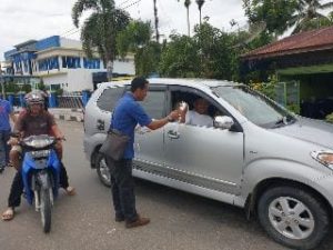 wartawan yang tergabung dalam Komunitas Gerak Wartawan Sijunjung (GWS) bagikan ratusan lembar masker gratis pada pengguna jalan, pada Senin (6/3/2020).