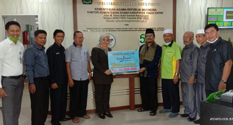 Pada kesempatan itu, Plt. Kepala Kemenag Tanah Datar H. Alizar Chan mengucapkan terima kasih kepada pimpinan Bank Nagari Cabang Syariah Batusangkar atas bantuan CSR Bank Nagari Syariah itu.