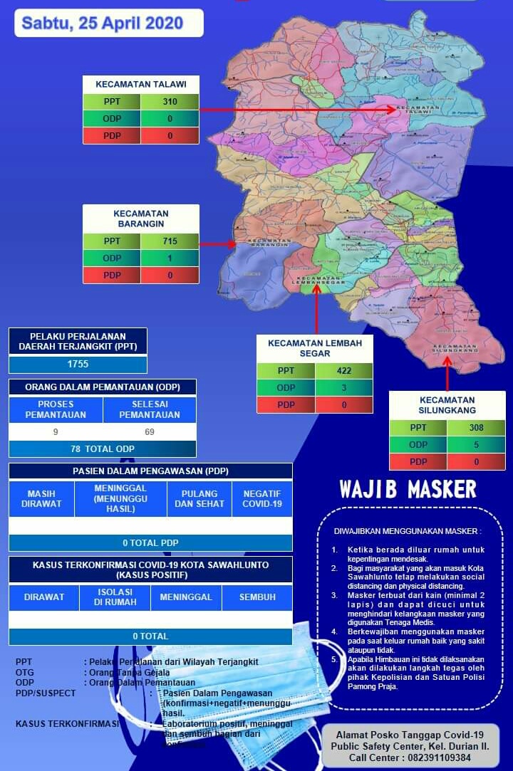 Hal itu diperoleh dari data Gugus Tugas Percepatan Penanganan (GTPP) Corona virus disease 2019 (Covid- 19) Kota Sawahlunto, pada Sabtu 25 April 2020 pukul 16.00 WIB atau hari ketiga diberlakukannya pelaksanaan Pembatasan Sosial Berskala Besar (PSBB).