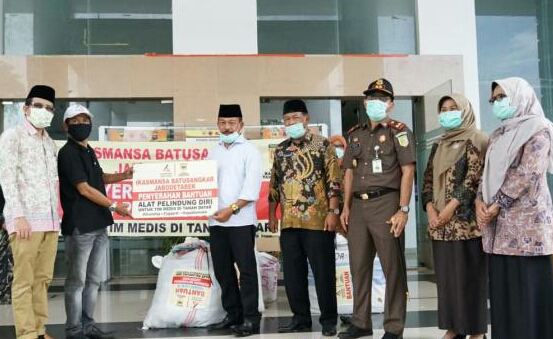 Penyerahan APD dari Ikasmansa Batusangkar Jabodetabek dihadiri Kepala Kejaksaan Negeri Tanah Datar Hardijono Sidayat, Kadis Kesehatan dr. Yesrita Zedrianis, Koordinator Divisi Logistik Nuryeddisman, Jubir Covid Roza Mardiah, dan petugas lain – habede