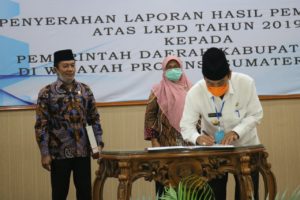 Penyampaian hasil pemeriksaaan tersebut diserahkan secara langsung Kepala Perwakilan Badan Pemeriksa Keuangan (BPK) Sumbar, Yusnadewi kepada Bupati Sijunjung, Yuswir Arifin dan Ketua DPRD Sijunjung, Bambang Surya Irawan, pada Rabu (20/5/20) di Kantor BPK Sumbar dengan menerapkan protokol kesehatan Covid-19.
