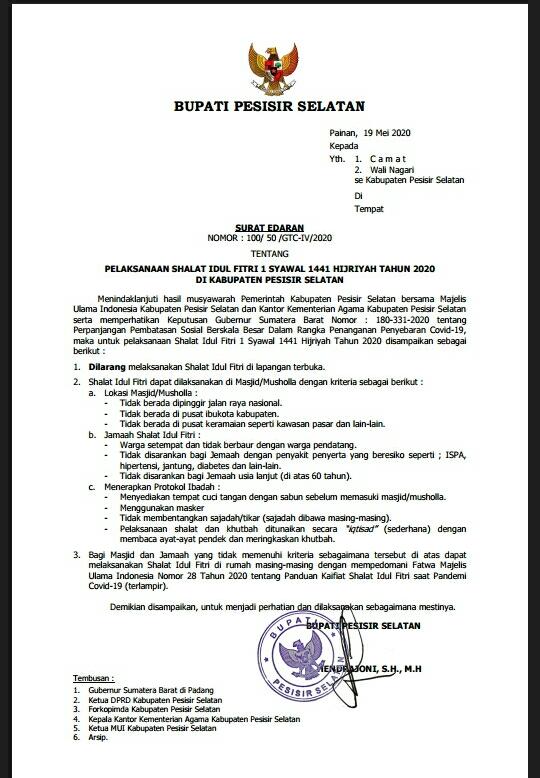 Berdasarkan hal tersebut, Bupati Pesisir Selatan, mengeluarkan surat edaran nomor ;100/ 50 /GTC-IV/2020 tentang pelaksanaan shalat idul fitri 1 syawal 1441Tahun 2020 Kabupaten Pesisir Selatan, tanggal 19 Mei 2020 menegaskan, dilarang melaksanakan Shalat Idul Fitri di lapangan terbuka dan diperbolehkan di masjid dengan syarat tertentu.
