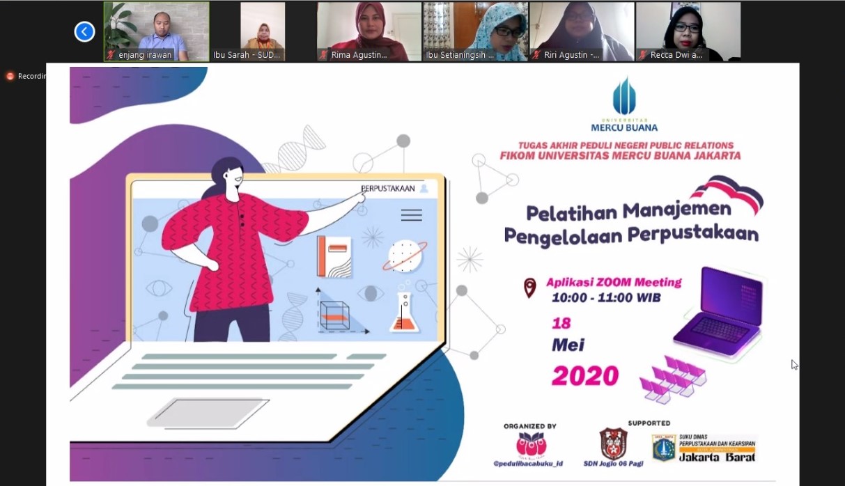 Pada tahun ini Tugas Akhir Peduli Negeri Universitas Mercu Buana yang terbentuk dalam sebuah tim bernama Peduli Baca Buku (PBB) menyelenggarakan Pelatihan Manajemen Pengelolaan Perpustakaan bersama Dinas Perpustakaan dan Kearsipan Jakarta Barat. Pelatihan atau yang biasa disebut dengan Bimtek berstandar Nasional ini diselenggarakan di Jakarta secara online dalam Aplikasi ZOOM Meeting, baru-baru ini.