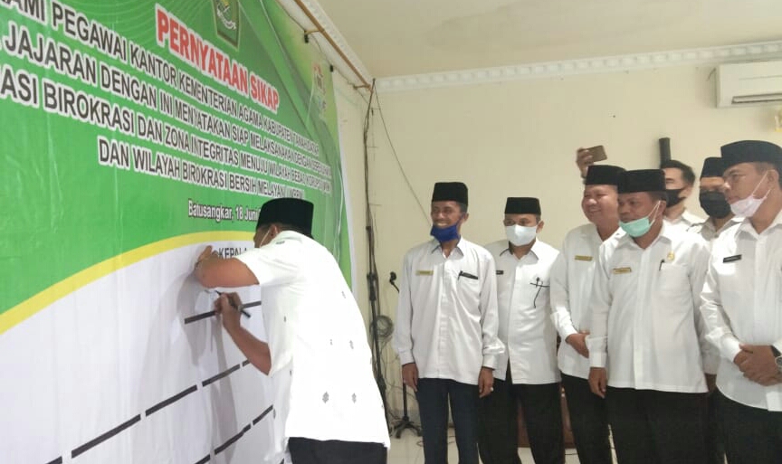 JURNAL SUMBAR | Batusangkar – Penandatanganan Pernyataan Sikap dalam pelaksanaan RB ( Reformasi Birokrasi ) dan Zona Integritas (ZI) dalam pelayanan tugas sebagai ASN dilaksanakan, Kamis(18/6/20) oleh Jajaran Kementerian Agama Kabupaten Tanah Datar di aula Kemenag setempat.