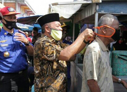 Selanjutnya wabup juga membagikan masker kepada pedagang dan pengunjung pasar yang tidak menggunakan masker dengan cara memasangkan kepada pedagang dan masyarakat – habede.