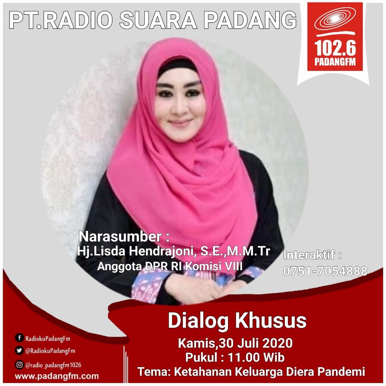 Lisda Hendrajoni dengan tema Ketahanan Keluarga di Era Pandemi” berinteraktif dengan masyarakat yang bergabung dengan Radio Padang FM di 102.6 G dari pukul 11.00 WIB hingga selesai.