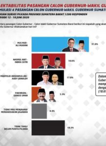 Hasil survey yang beredar di banyak grup WhatsApp itu menyebutkan, elektabilitas pasangan Mulyadi-Ali Mukhni 31,6 persen. Kemudian disusul Nasrul Abit-Indra Catri 18,6 persen, Mahyeldi-Audy 17,8 persen, dan Fakhrizal-Genius Umar 5,3 persen.