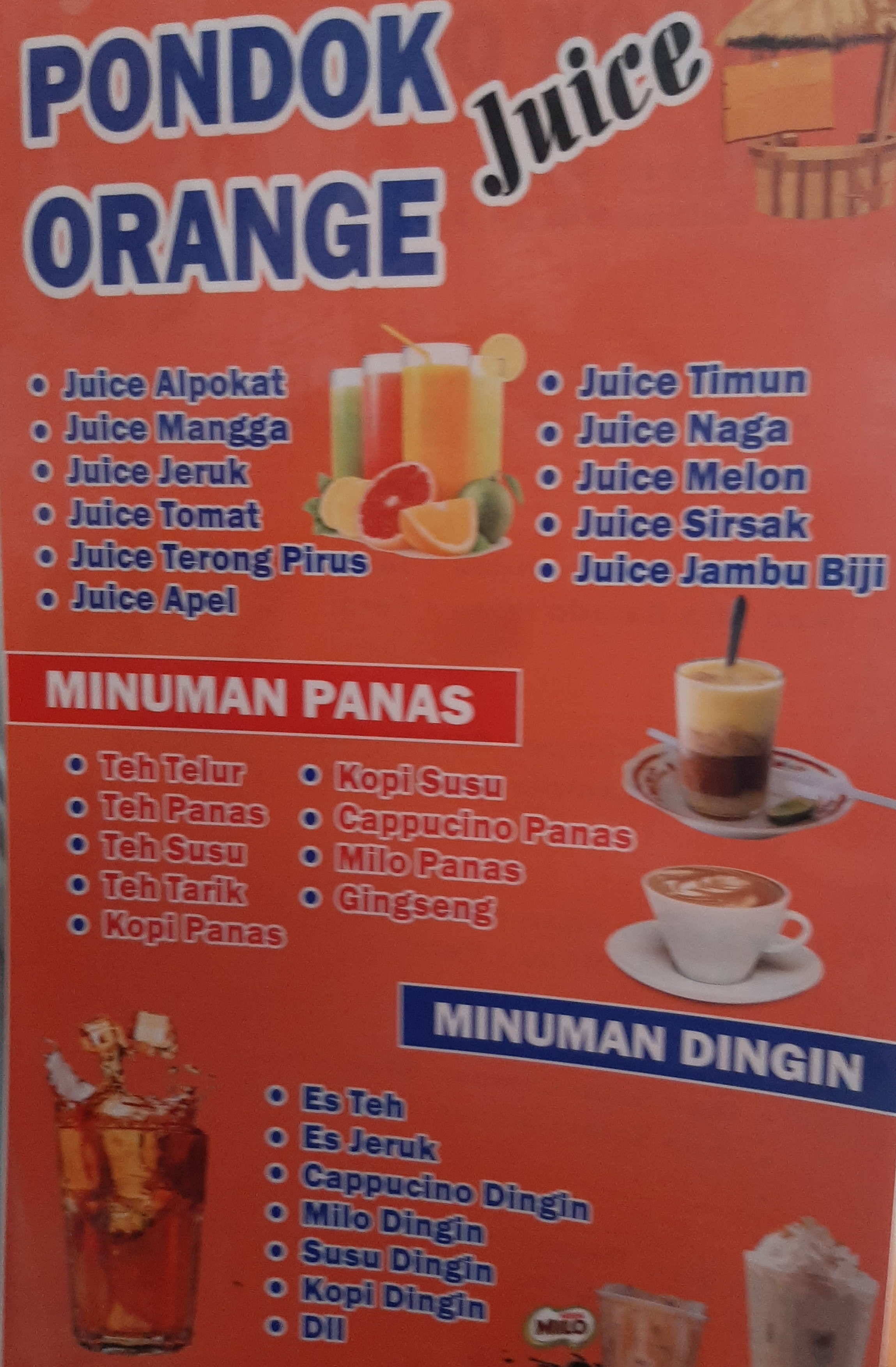 “Bagi yang suka minuman juss, di Pondok Orange juga tersedia, baik hangat maupun dingin. Kami yakin, menu yang kami sajikan sangat cocok dan tepat untuk membuka selera anda. Kami juga siap melayani pesanan untuk anda yang butuh masakan Pondok Orange. Hubungi kami di nomor ; 082297624269,”kata Gonto.