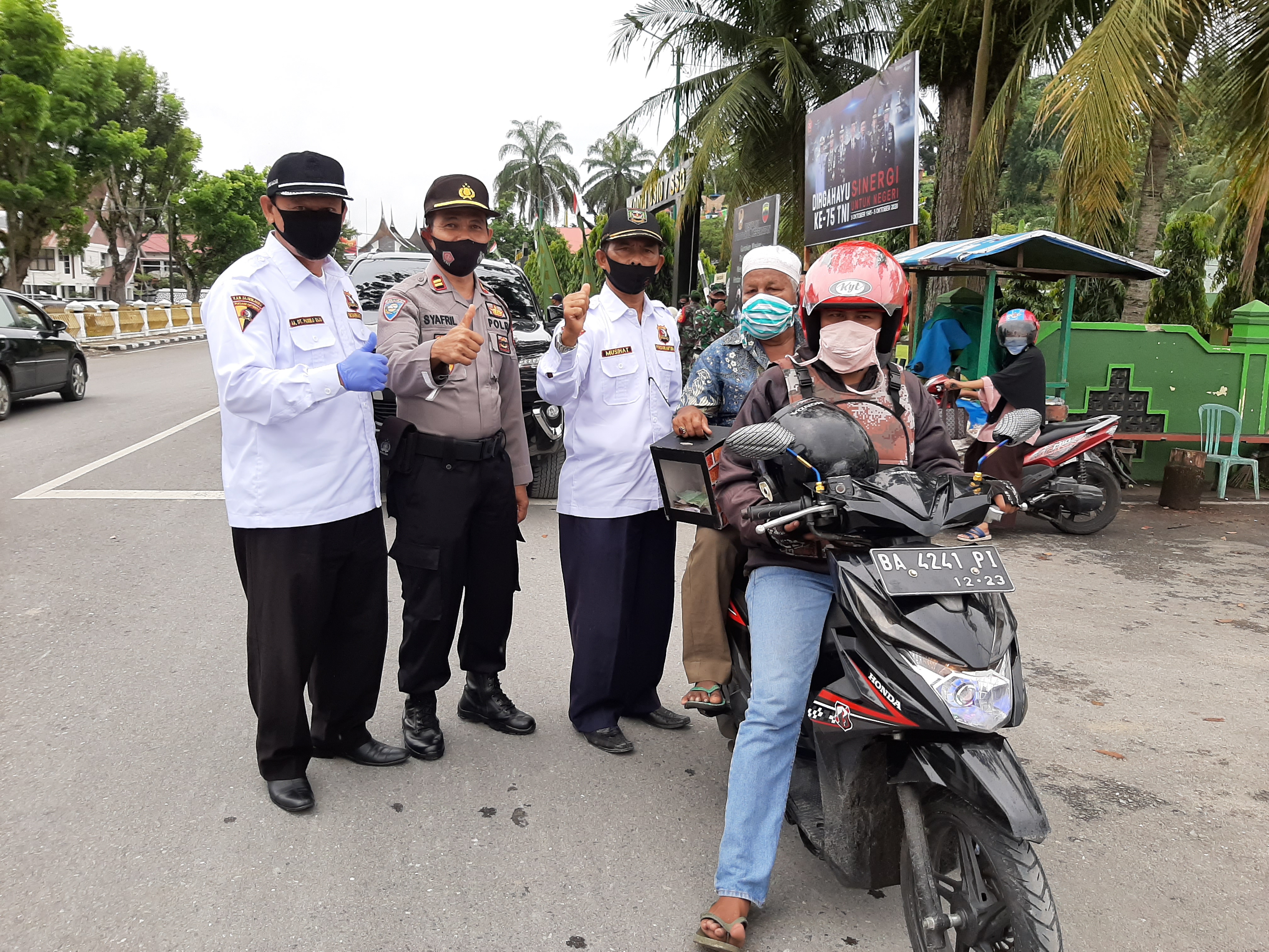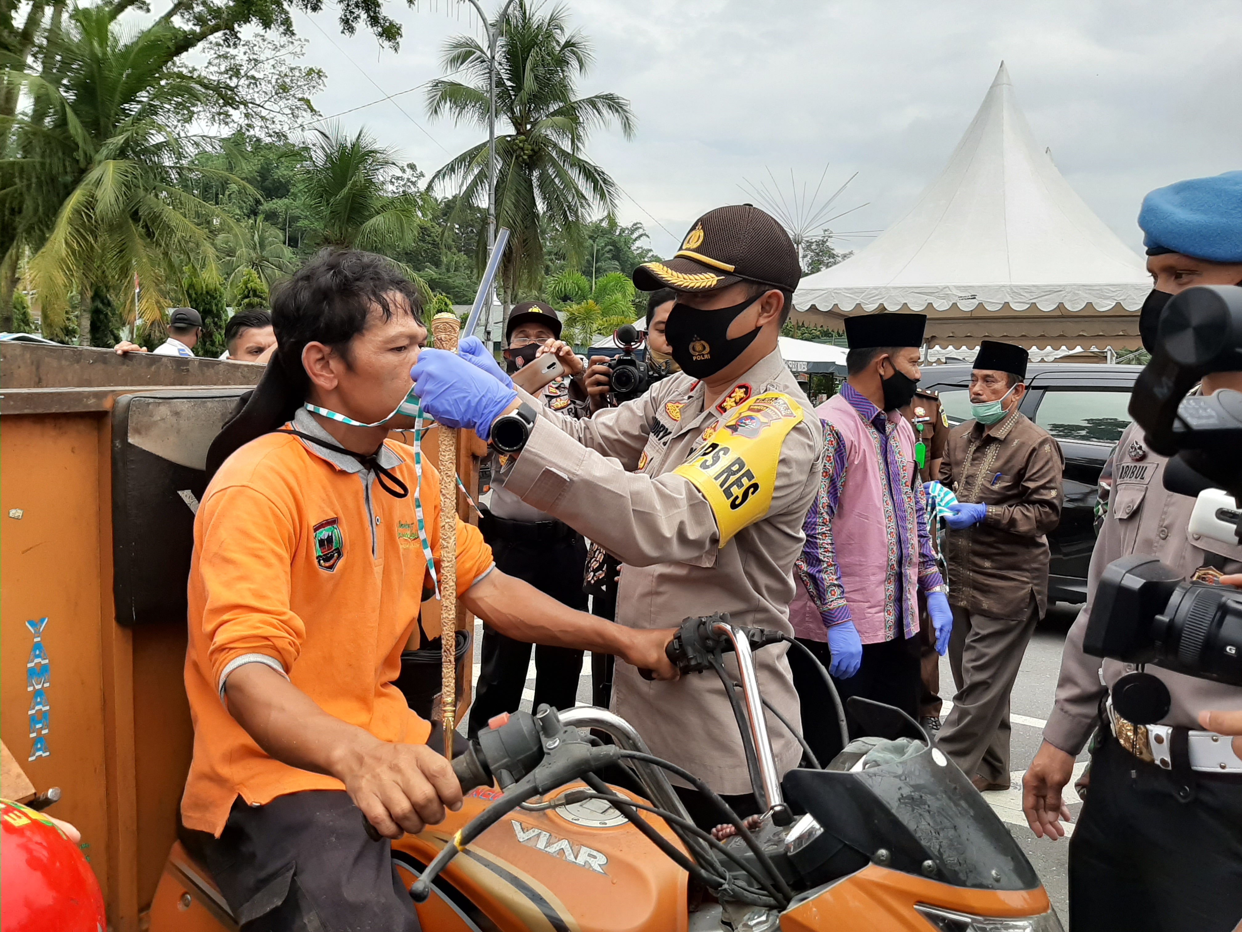 AKBP Andry Kurniawan, bupati Yuswir Arifin, Sekdakab Zefnihan, unsur Forkopimda dan paslon bupati juga ikut serta membagikan masker pada warga yang tak pasang masker.