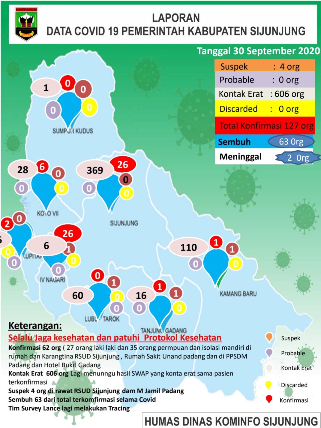 JURNAL SUMBAR | Sijunjung – Parah dan gawat..! Ternyata penyakit yang menakutkan tak bisa dilihat dengan mata bernama coronavirus (Covid-19) itu..? Kini, menyerang klaster perkantoran di lingkup Pemkab Sijunjung, Sumatera Barat. Bahkan corona virus itu sempat merenggut dua nyawa. Pagi ini (Rabu, 30/9/2020-red), pasien positif tembus angka 127 orang.