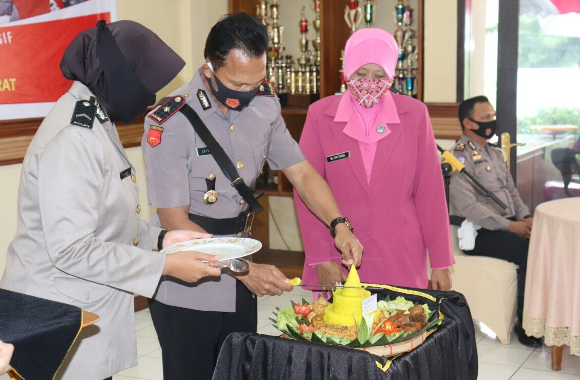 Usai upacara dilanjutkan dengan pemotongan tumpeng oleh wakapolres Kompol Eridal disaksikan seluruh jajaran Polwan, dan PJU Polres Tanah Datar – habede.