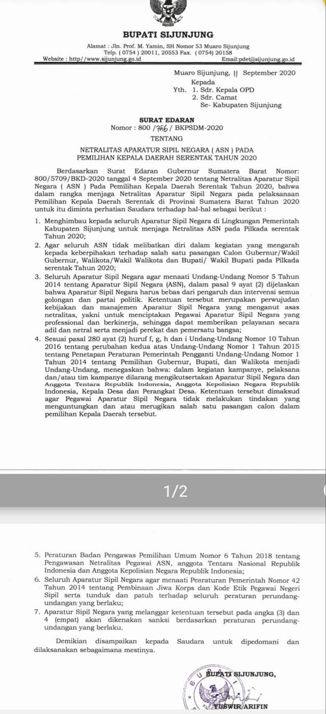 Penegasan yang sama juga disampaikan Bupati Sijunjung, Sumatera Barat, Drs. H. Yuswir Arifin Dt Indo Marajo terkait surat edaran ASN dilarang melakukan politik praktis juga meneruskan surat edaran Gubernur Sumbar.