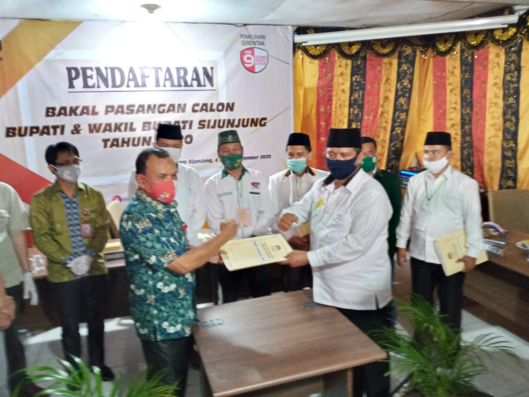 Setelah memeriksa berkas syarat pencalonan, Ketua KPU Sijunjung, Lindo Karsyah menyatakan seluruh syarat Paslon H.Hendri Susanto, Lc-Indra Gunalan, S.Ap lengkap.