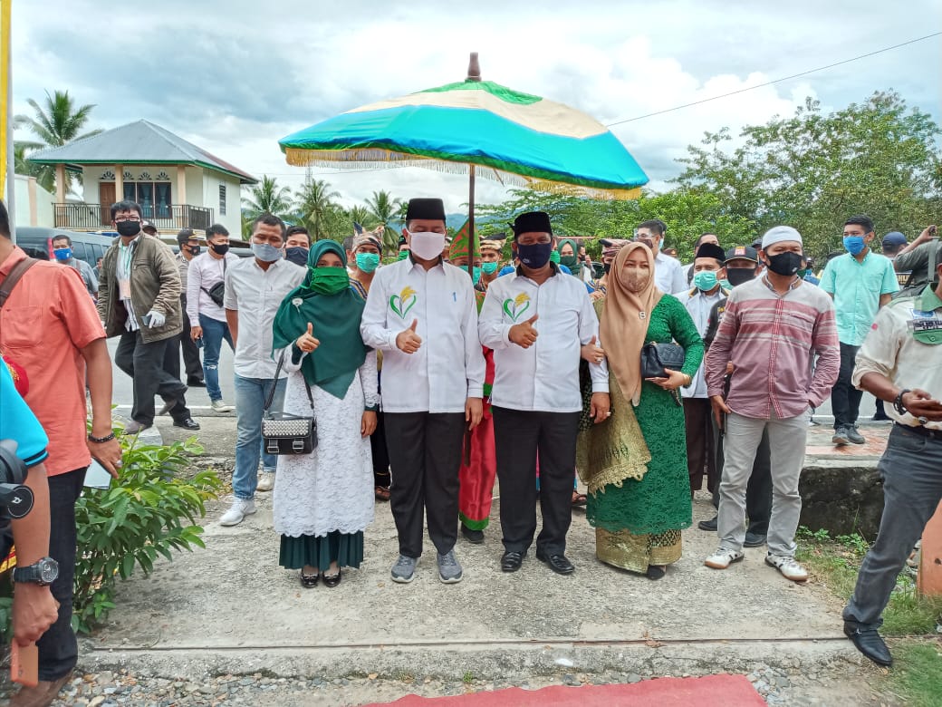 Kemudian sekitar pukul 13.45 WIB, H.Hendri Susanto-Indra Gunalan tiba di KPU dengan iringan ala anak daro. Setibanya di pekarangan KPU, Paslon langsung menjalani cek suhu.