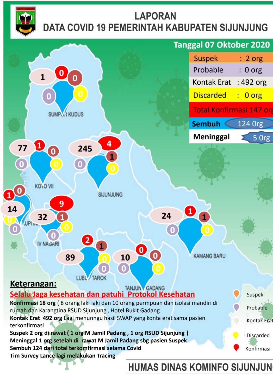 Dijelaskan Rizal, hingga Rabu (7/10/2020) sebanyak 18 pasien positif Covid-19 masih di isolasi di Hotel Bukik Gadang, Muaro Sijunjung dan juga ada suspek dua orang dirawat di RSUD Sijunjung dan RS M Djamil Padang. Sedangkan yang kontak erat mencapai 492 orang.
