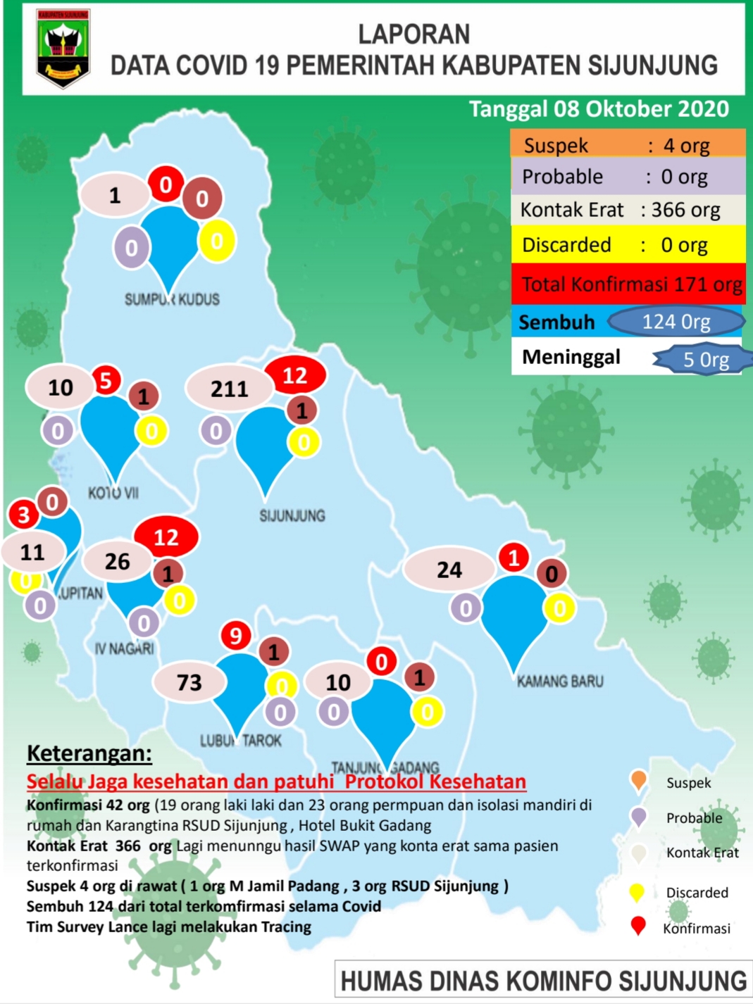 JURNAL SUMBAR | Sijunjung – Hingga hari ini (Jumat, 9/10/2020-red), Warga Terkonfirmasi Positif Covid-19 di Sijunjung, Sumatera Barat, tembus angka 171 Orang. Sementara yang sembuh 124 orang dan meninggal capai lima orang.