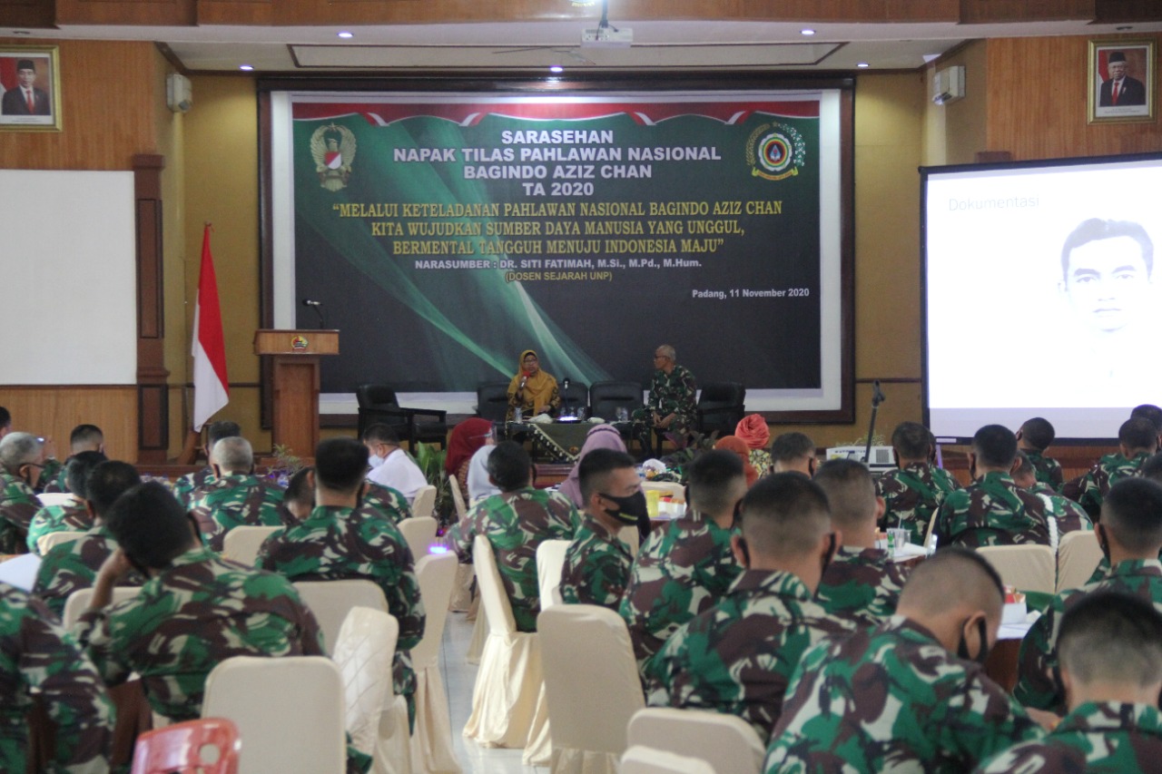 Kadisbintalad Brigjen TNI Edison dalam sambutannya yang dibacakan oleh Kolonel Inf Eko Astono J. Kalimantoro dalam kegiatan sarasehan pahlawan Bagindo Aziz Chan di Gedung Sapta Marga makorem 032/Wbr mengatakan kegiatan ini adalah salah satu program Disbintalad bidang Ideologi dan Kejuangan yaitu kegiatan napak tilas pahlawan, kebetulan tahun ini sasarannya di Kodam I/BB dan salah satu pahlawan yang kami pilih dari 15 pahlawan dari ranah minang yaitu adalah Bagindo Aziz Chan, Rabu (11/11/2020)