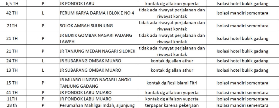 “Ke-46 orang tersebut terdiri dari 26 laki-laki dan 20 perempuan. Mereka ada yang diisolasi mandiri di rumah dan ada juga yang dikarantinakan di Hotel Bukik Gadang dan di RSUD Sijunjung,”jelas Rizal.