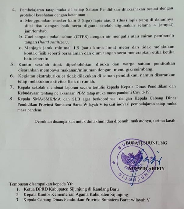 “Ya, sesuai SE bupati, pelaksanaan PBM baik tingkat PAUD, TK, SD/MI, SMP/MTs/SMU/SMK sederajat harus seizin orang tua,”kata Ramler. Berikut isi surat SE Bupati Sijunjung itu.ius