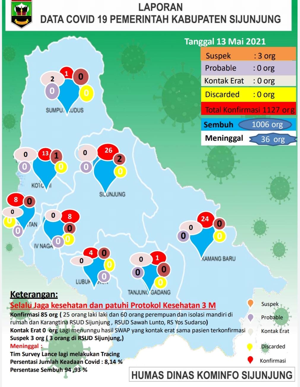“Dengan adanya penambahan tersebut, maka jumlah warga Sijunjung terkonfirmasi mencapai 1.127 orang. Sedangkan yang masih terkonfirmasi sebanyak 85 orang, mereka terdiri dari 60 orang perempuan dan 25 orang laki – laki,”papar Rizal.