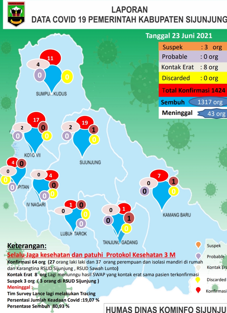 JURNAL SUMBAR | Sijunjung – Pada Rabu (23/6/2021-red) ini, sebanyak enam orang warga di Kabupaten Sijunjung, Sumatera Bara, sembuh dari Covid-1. Sehingga warga sembuh mencapai 1.317 orang. Selain itu, warga terpapar positif Covid-19 juga bertambah satu orang.
