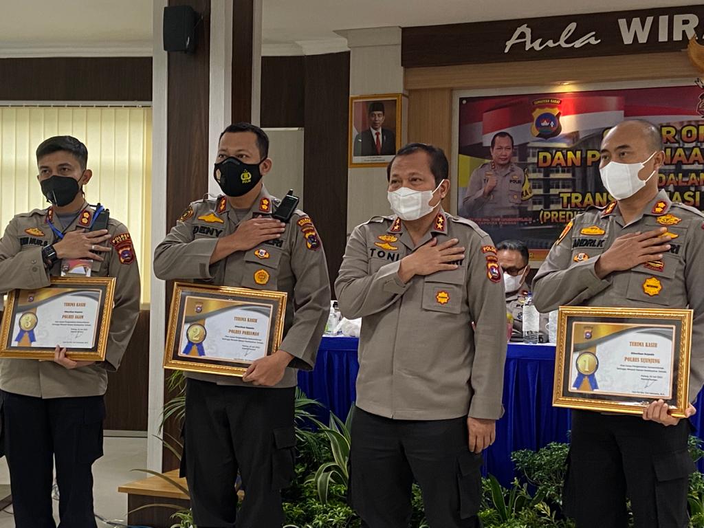 JURNAL SUMBAR | Sijunjung – Kapolda Sumbar, Irjen Pol Drs Toni Harmanto, MH, pada Selasa (22/6/2021) di Aula Airud Polda Sumbar berikan penghargaan kepada Polres Sijunjung atas prestasi dalam menjaga Kamtibmas diwilayah hukum Mapolres setempat.