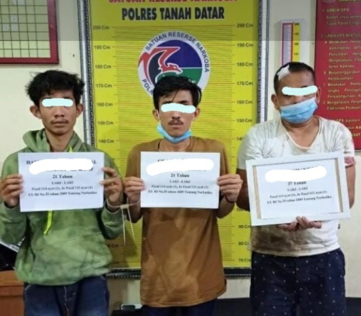 Selanjut nya ketiga tersangka dan BB disita dan dibawa ke Polres Tanah Datar untuk proses Penyidikan lebih lanjut. Para tersangka, sebut Desfi Arta, dapat dijerat Pasal 114 ayat (1) Jo Pasal 112 ayat (1) Jo Pasal 132 ayat (1) UU No 35 Tahun 2009 tentang Narkotika dengan ancaman hukuman 5 tahun, dan maksimal 20 Tahun penjara – habede