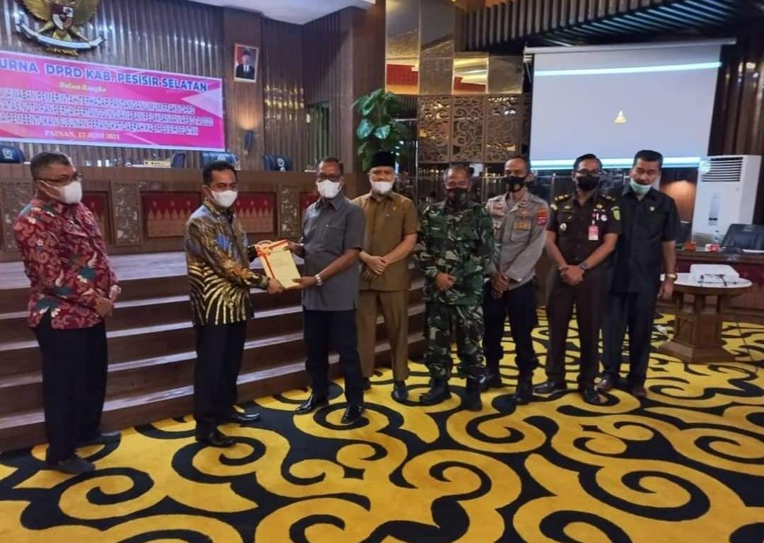 JURNAL SUMBAR | Pesisir Selatan – Wakil Bupati Pesisir Selatan, Rudi Hariyansyah menyampaikan jawaban pemerintah daerah atas pandangan umum fraksi DPRD terhadap 2 Ranperda pada rapat paripurna yang dipimpin Wakil Ketua DPRD, Aprial Habbas, Kamis (17/6/2021) di ruang rapat DPRD setempat.