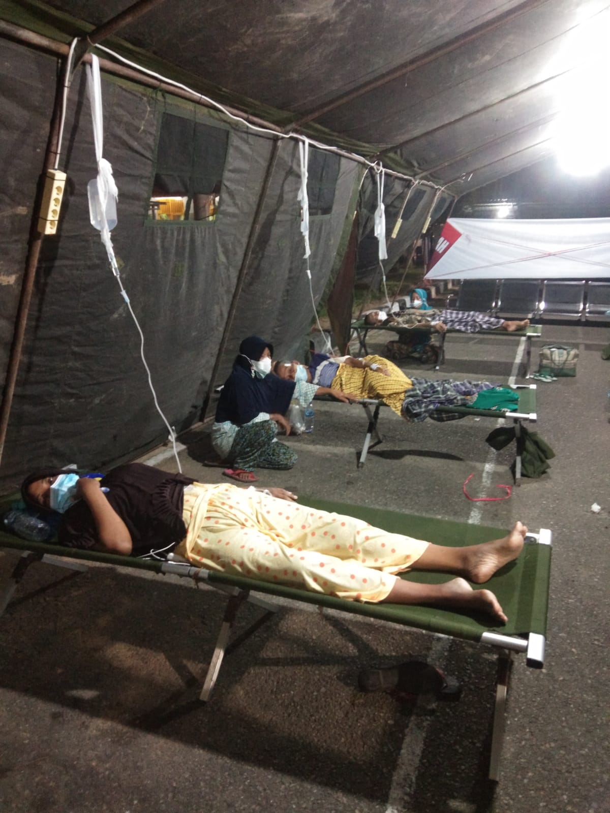 Berdasarkan pantuan wartawan, Kamis (22/7/2021) pukul 23.30 Wib terlihat ada tiga orang pasien positif Covid -19 menjalani perawatan di tenda sementara. Dengan dipasang Intravena (IV) alias infus, pasien Covid -19 tetap mendapatkan perawatan dan pengawasan dari petugas medis rumah sakit.