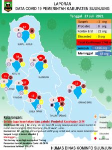 JURNAL SUMBAR | Sijunjung – Pada hari ini (Selasa, 27/7/2021-red) terjadi lagi lonjakan. Sebanyak 39 warga Sijunjung, Sumatera Barat, dinyatakan terpapar positif Covid-19 dan 42 warga lainnya juga sembuh dari Covid-19. Selain itu juga ada data warga yang telah jalani vaksin.