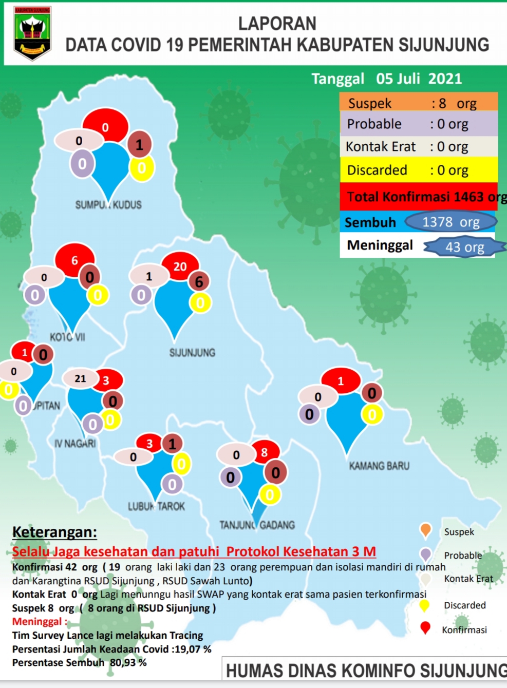 “Hari ini tak ada penambahan sembuh maupun kasus baru Covid-19. Selain itu, pada Minggu (4/7/2021-red) ini tak ada penambahan sembuh. Sehingga total warga sembuh selama pandemi sama seperti hari sebelumnya, yakni mencapai 1.378 orang,” kata Kepala Dinas Kominfo Sijunjung, Sumatera Barat, selaku Juru Bicara Penanggulangan Penanganan Covid-19, Rizal Effendi, kepada Jurnalsumbar.Com via whatsappnya, Senin (5/7/2021) sore.
