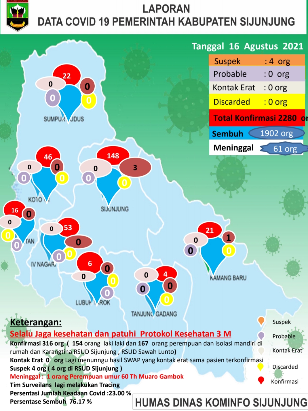 “Yang masih terkonfirmasi masih ada sebanyak 316 orang orang. Mereka ada yang jalani Isoman dirumah dan ada yang dikarantina di RSUD Sijunjung,“sebut Rizal.Berikut pasien sembuh dari Covid-19