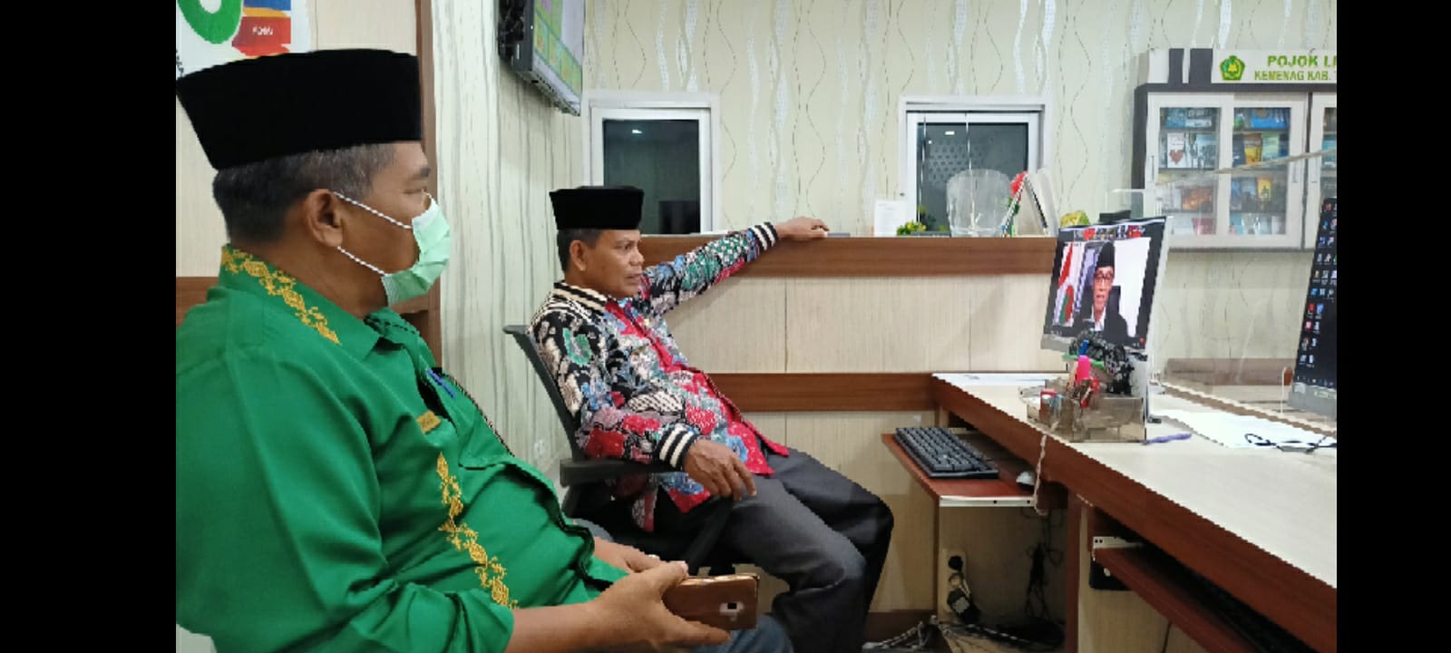 JURNAL SUMBAR | Batusangkar – Kepala Kantor Kementerian Agama Kabupaten Tanah Datar H.Syahrul bersama Kasubbag TU H. Yusmarli mengikuti Webinar Kebangsaan Lintas Agama dengan Menteri Agama melalui Zoom meeting, Rabu (18/8) yang berlangsung di ruang lobby kantor Kemenag Kabupaten Tanah Datar, Batubalang.