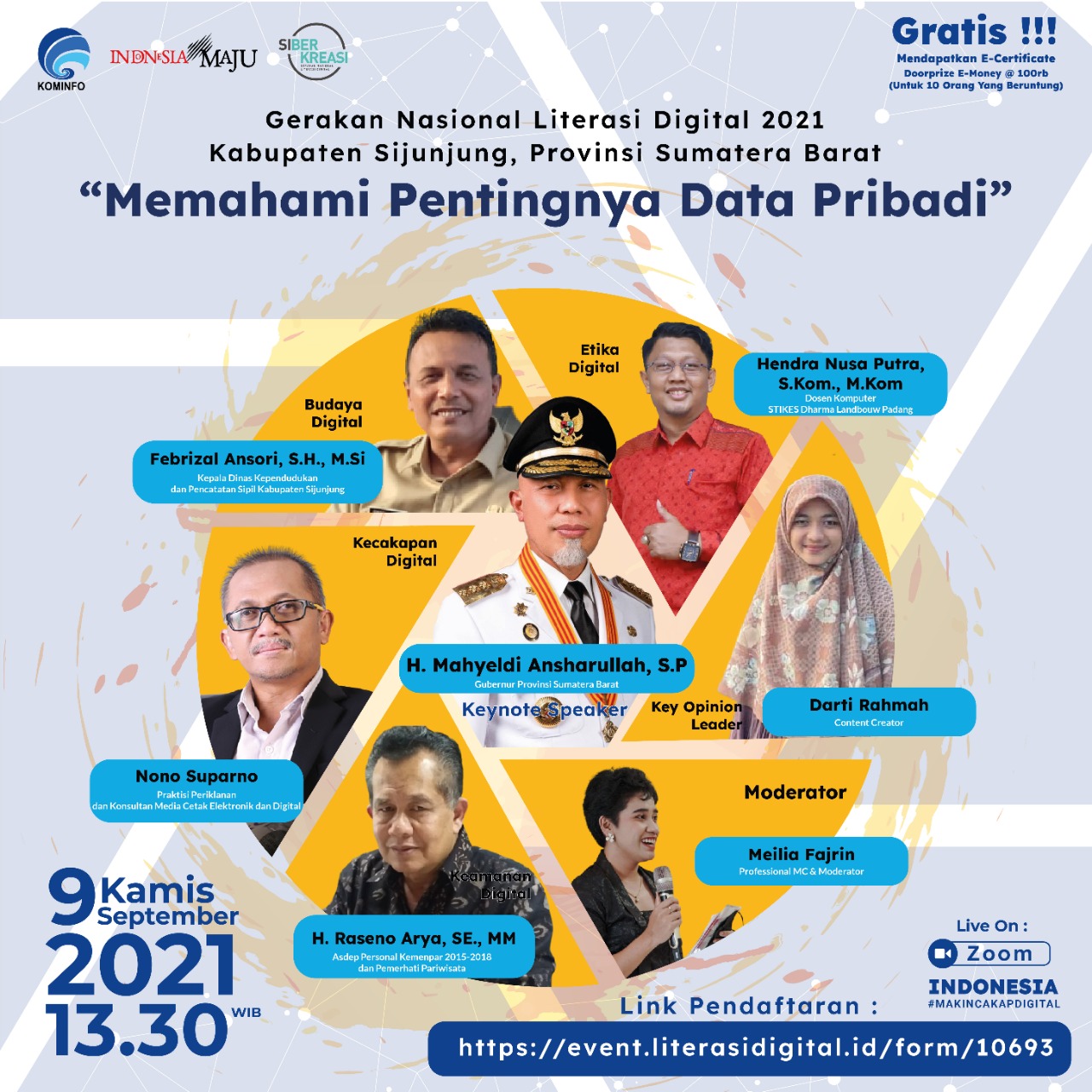 Disebutkannya, dalam Webinar itu akan membahas Pentingnya Data Pribadi. “Webinar Gratis 100 Persen, E-sertifikat dari Kementerian Kominfo, Secara nasional sudah dibuka oleh Presiden Joko Widodo dan Ada Hadiah Voucher menarik untuk 10 peserta berupa e-money sebesar Rp100.000,”terang Feri begitu sapaan akrab Kadis Dukcapil Kabupaten Sijunjung, Febrizal Ansori, S.H., M.Si tersebut.
