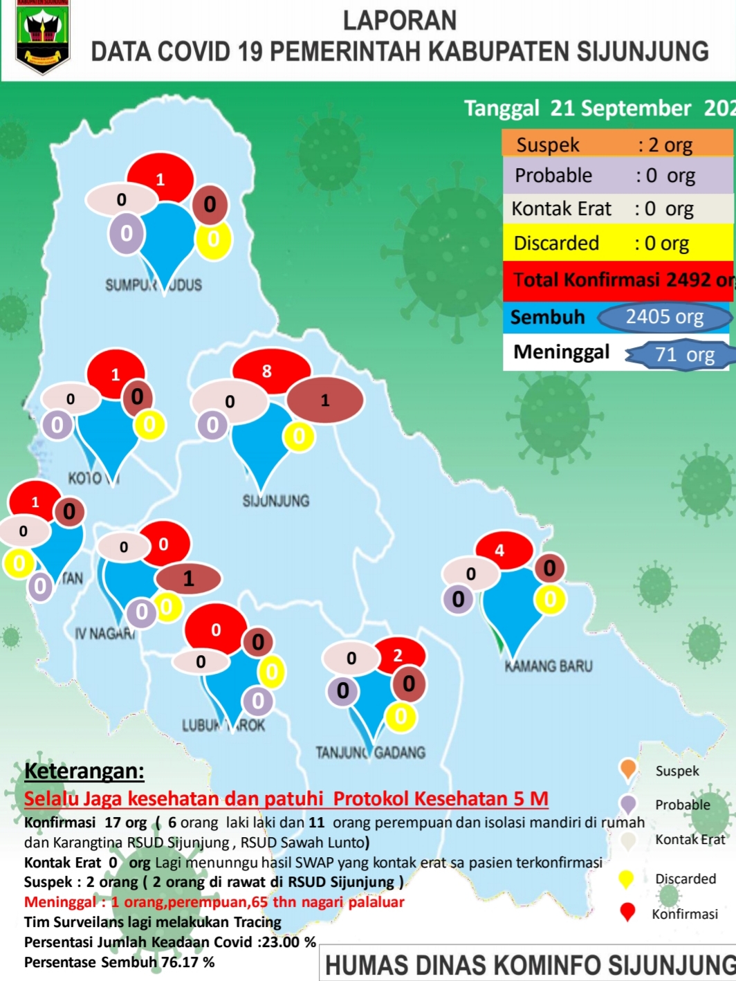 JURNAL SUMBAR | Sijunjung – Meski ada seorang perempuan, 65 tahun, warga Nagari Palaluar, Koto VII, meninggal dunia sebagai kabar duka. Namun pada hari yang sama (Selasa, 21/9/2021) sebanyak 17 orang warga di Kabupaten Sijunjung sembuh dari Covid-19.