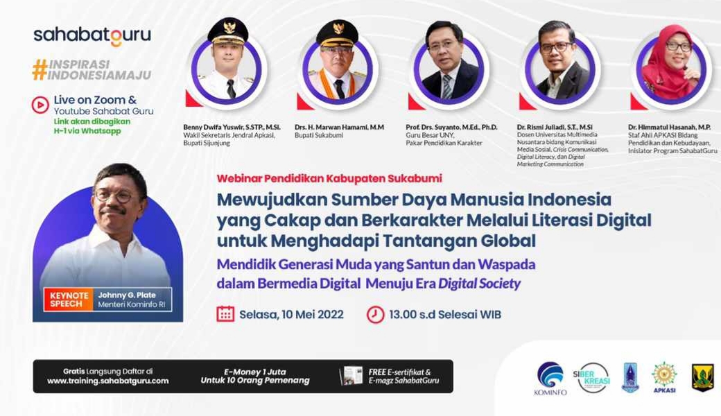 Selain Wakil Sekjend Apkasi (Benny Dwifa Yuswir-red), dalam Webinar itu juga menampilkan Bupati Sukabumi H.Marwan Hamami,MM, Prof.Drs. Suyanto, M.Ed,Phd (Pakar Pendidikan Karekter-red), Dr. Rismi Juliadi, ST.M.Si (Dosen Universitas Multi Media Nusantara Bidang Komunikasi Mediasosial, Crisis Communition Digital Literacy dan Digital Marketing Communition) dan Dr. Himmatul Hasanah,Mp (staf ahli Apkasi Bidang P dan K – Inisiator Program Sahabat Guru-red) juga sebagai narasumber/pameteri.