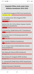Ir. Irland M.M (Anggota DPRD Kota Sawahlunto) masih memimpin klasmen sementara polling dengan dukungan 529 votes (32%) dan disusul urutan kedua istri Wawakot Sawahlunto, Ir. Hj. Neldaswenti, MSi (Anggota DPRD Sawahlunto) dengan raihan 352 votes (21%).