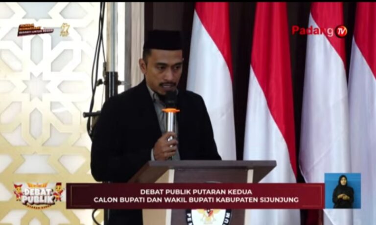 JURNAL SUMBAR | Sijunjung – Komisi Pemilihan Umum (KPU) Kabupaten Sijunjung, Sumatera Barat, menggelar debat publik putaran kedua bagi pasangan calon Bupati dan Wakil Bupati Sijunjung. Debat putaran kedua itu, dibuka secara langsung oleh Ketua KPU Sijunjung, Dori Kurniadi. Sebelum Debat berlangsung, Bumi Ranah Lansek Manih sempat diguyur hujan lebat. Sekitar pukul 20.00 WIB, hujan … Lanjutkan membaca Debat Publik Putaran Kedua Calon Bupati dan Wakil Bupati Sijunjung, Bahas Transformasi SDA