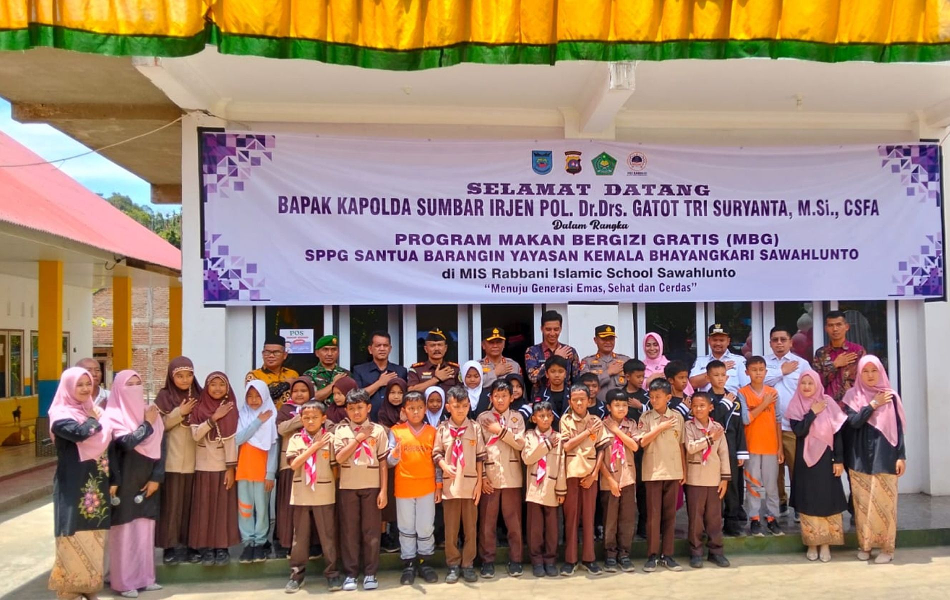 Kapolda Sumbar Irjenpol Gatot Tri Suryanta didampingi Walikota dan Kapolres Sawahlunto Berkesempatan foto bersama siswa daerah itu usai peresmian dapur MBG. ((Foto. Ist)