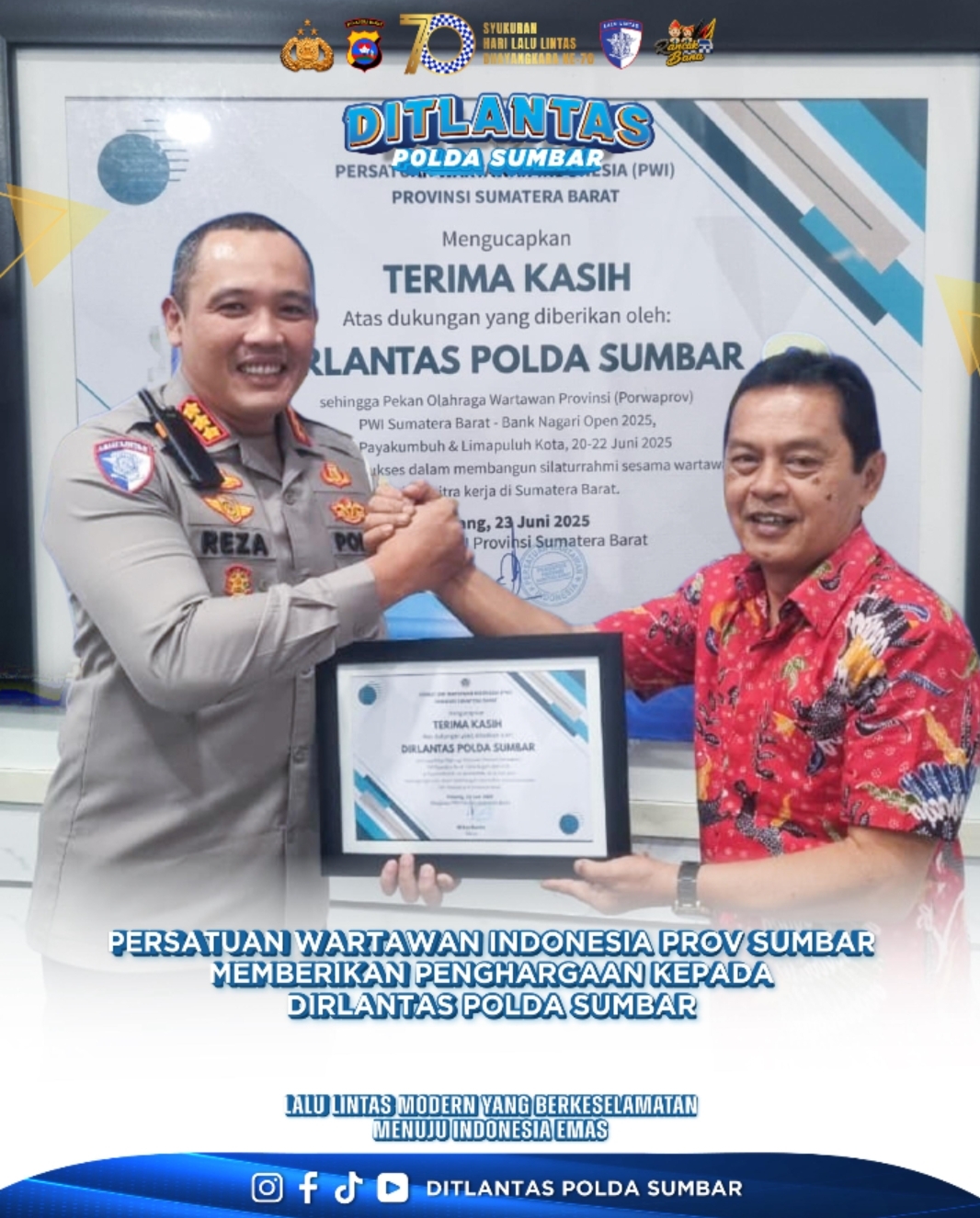 JURNAL SUMBAR| Padang – Persatuan Wartawan Indonesia (PWI) Sumatera Barat, menyampaikan apresiasi dan ucapan terima kasih kepada Direktorat Lalu Lintas (Ditlantas) Polda Sumbar atas dukungan yang diberikan dalam berbagai kegiatan organisasi wartawan tersebut.
