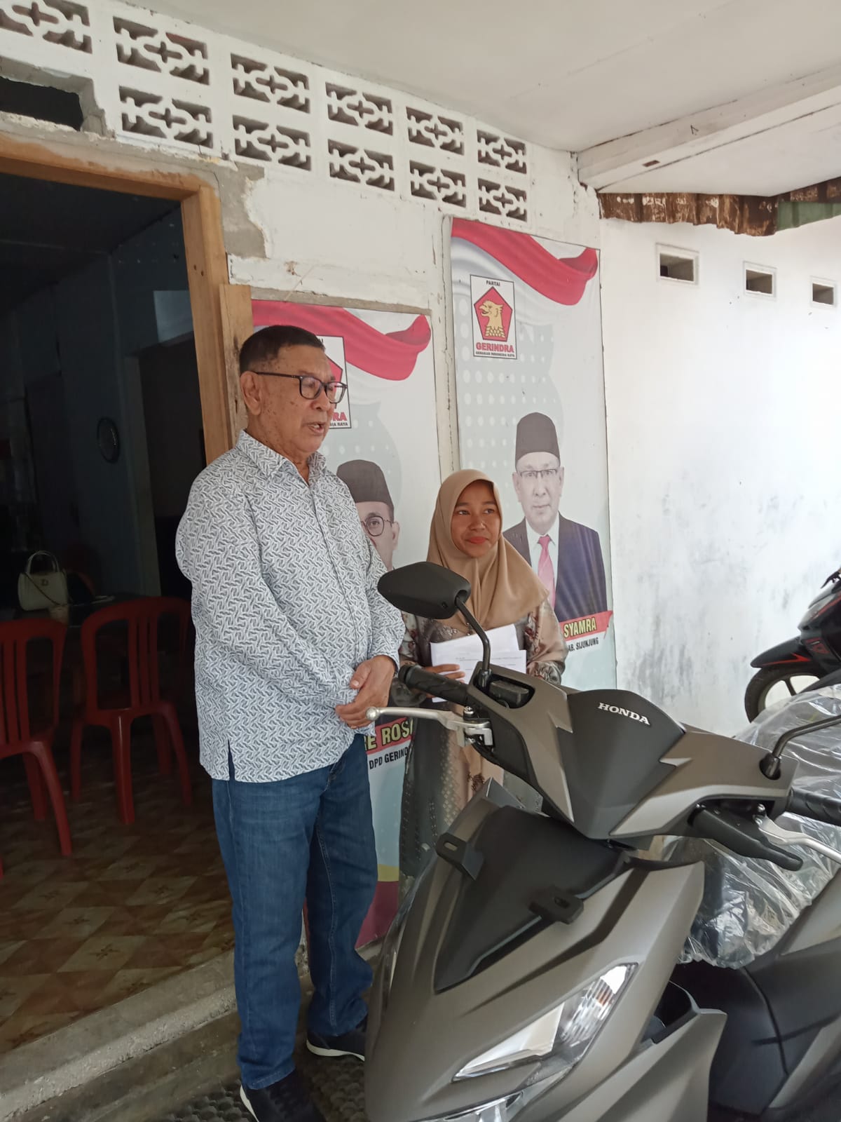 Ketua DPC Partai Gerindra Sijunjung, Drs. Syahril Syamra Dt Bgd Nan Putiah menyerahkan bantuan berupa sepeda motor dari Wakil Ketua Komisi VI DPR RI, Andre Rosiade kepada guru TK Nagari Langki